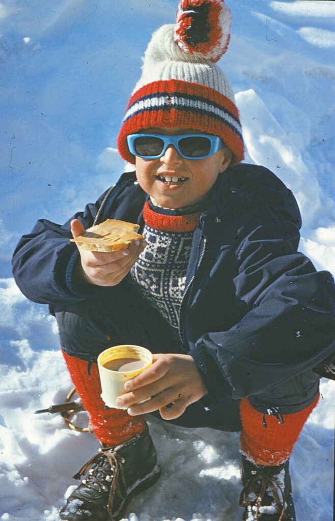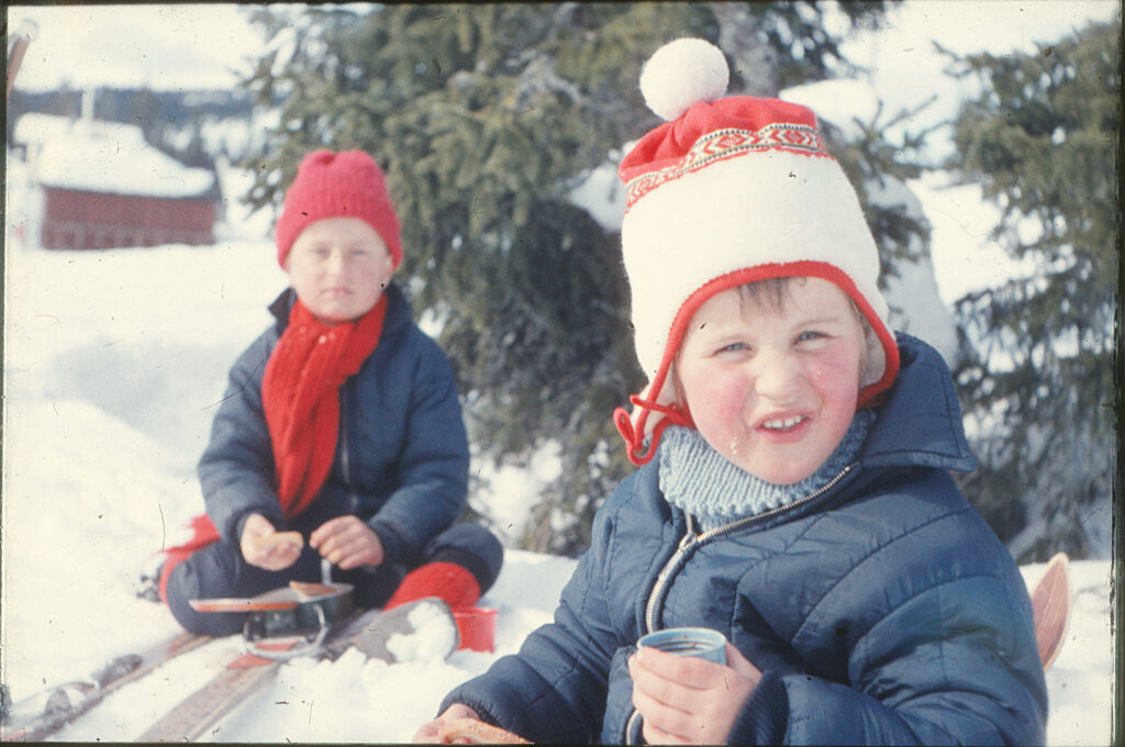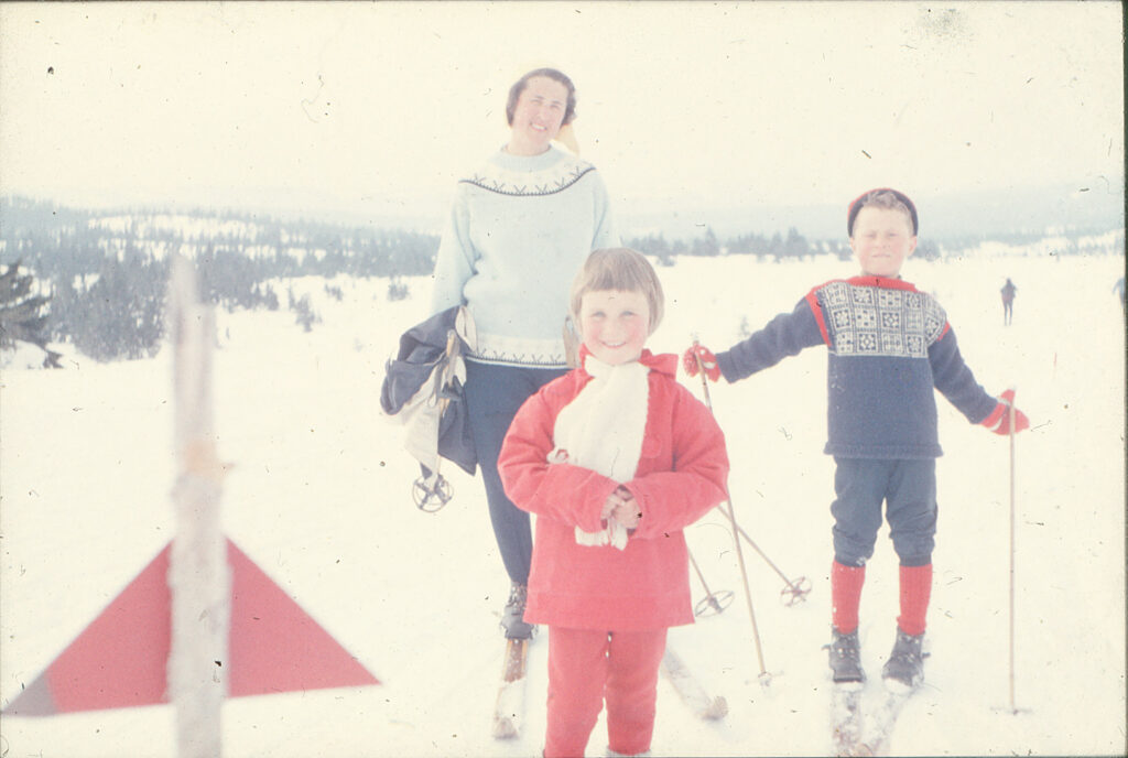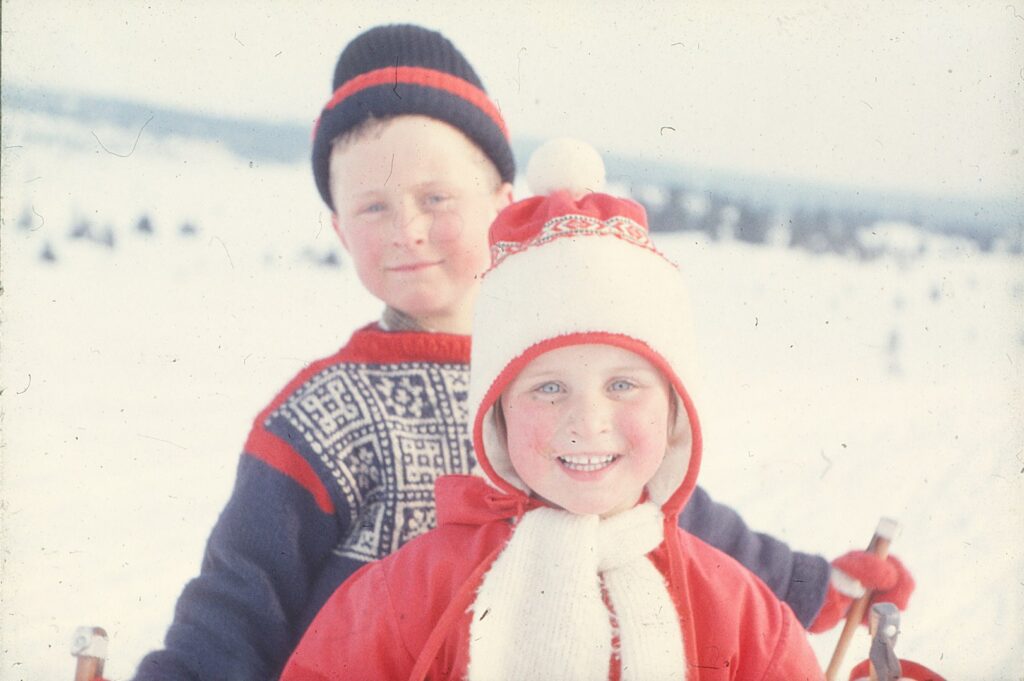 Noen bilder av min bror, min mor og meg, tatt på vinteren på slutten av 60-tallet. Noen som vet hva slags mønster broren min har på genseren sin? Jeg tror det må være en OL-, eller VM-genser. Mønsteret er veldig fint!