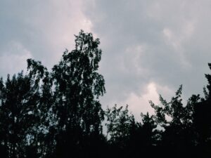 Det er tidlig kveld på hytta, og ute har himmelen virkelig åpnet seg. Det lyner og tordner, og regnet strømmer