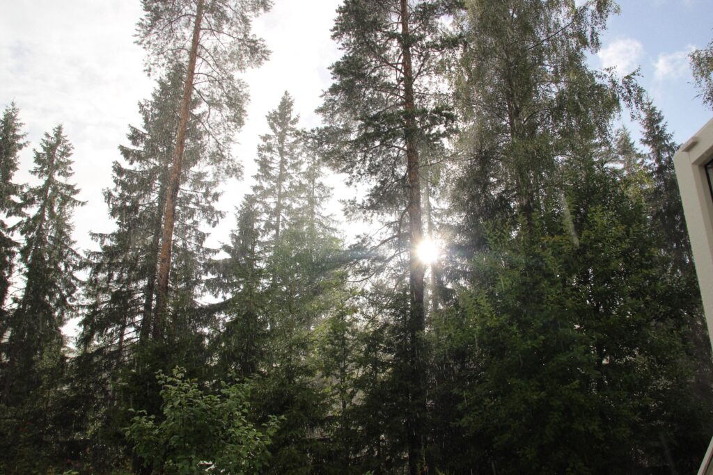 Jeg tenker på eventyret om Soria Moria slott som lyste i det fjerne, og det er nesten som om det er et slik slott her hos oss, bare bakom trekronene der. Der hvor det vanligvis er så mørkt. Solregnet gjør at alt rundt oss blir lyst og trivelig.