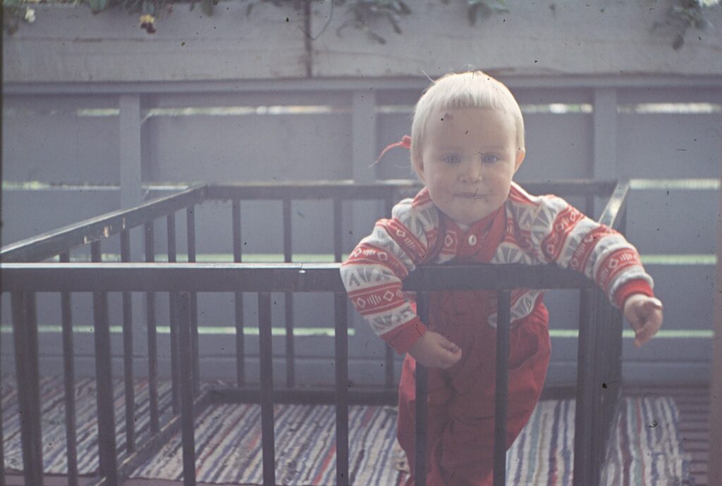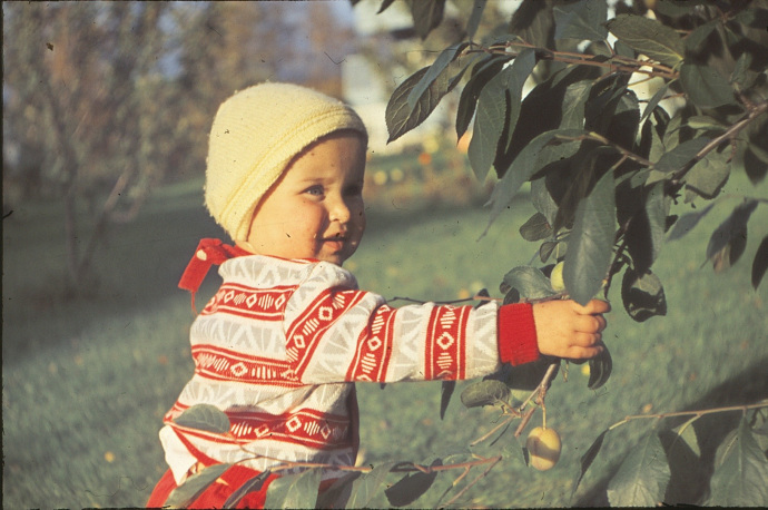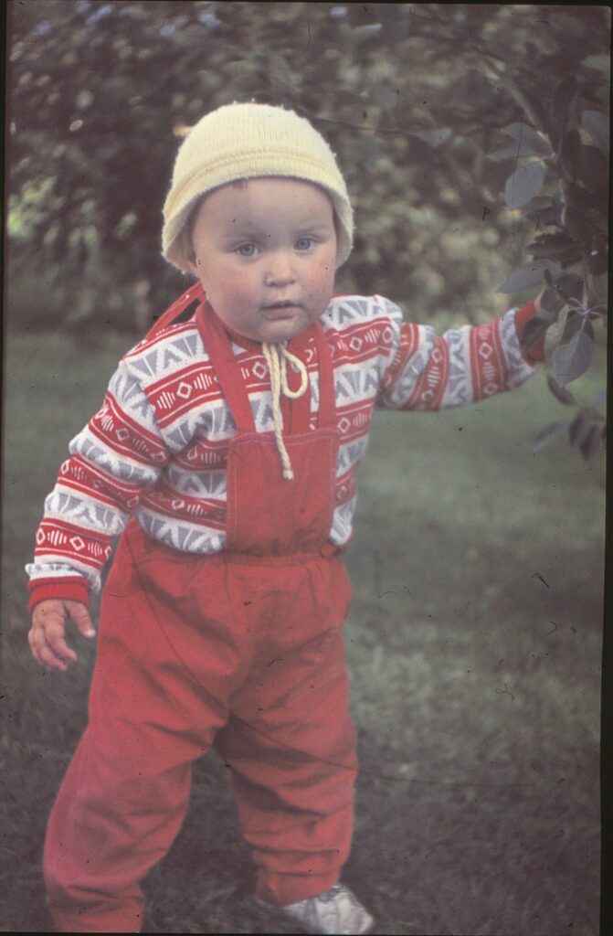 Disse bildene er nok tatt en fin høstdag i 1963, og jeg tror at jeg må være rundt 16 måneder på bildene. Lekegrinda var nok ikke mitt favorittsted:). Da er det mye mer spennende å gå ut i hagen for å leke med vannkraner og trær, og for å utforske verden. Kanskje dette er mitt første møte med høstens modne plommer?