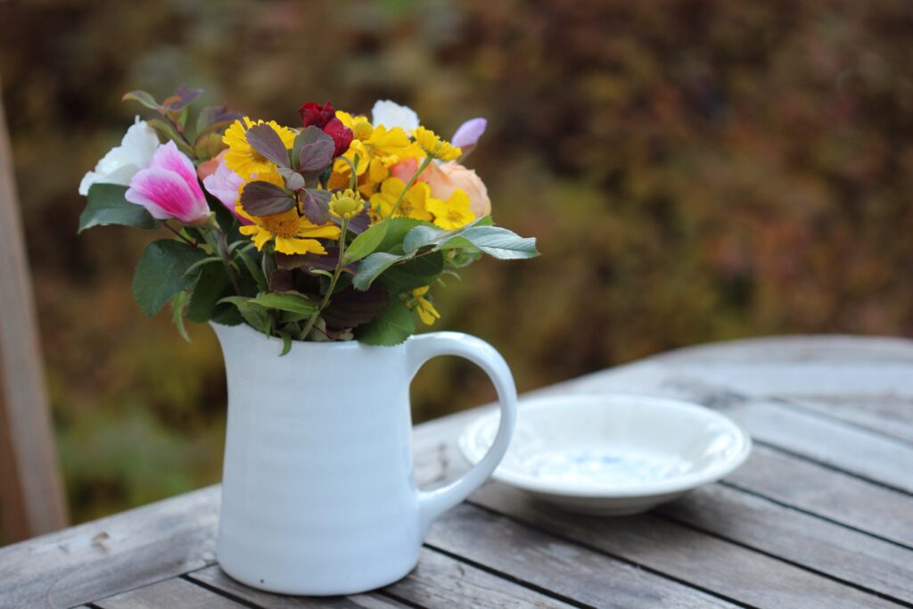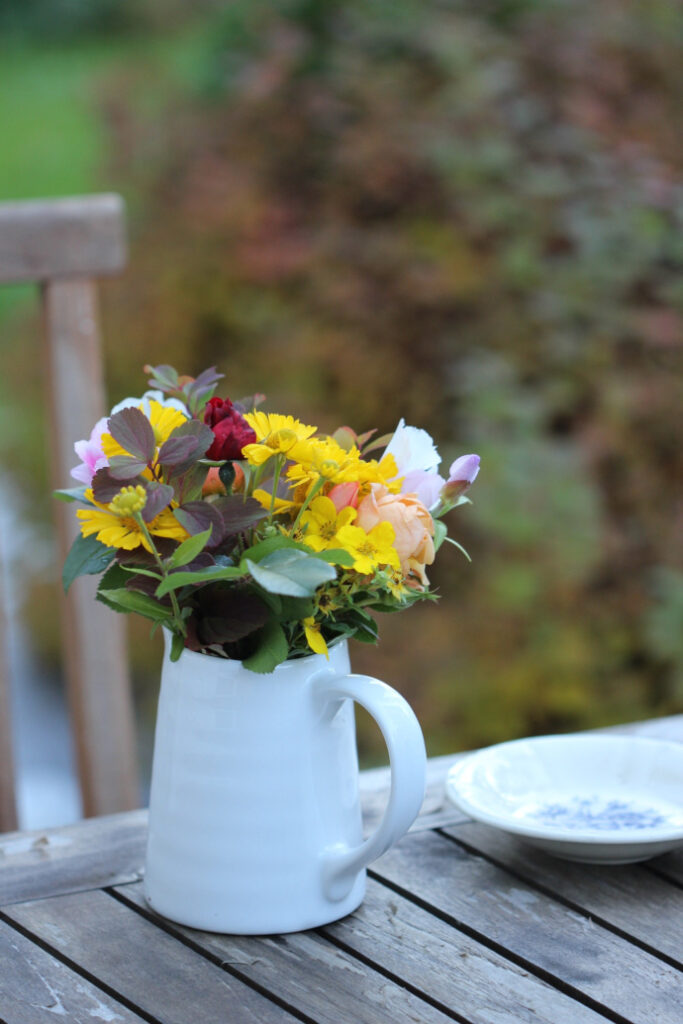 Det er med et visst vemod jeg plukker inn de aller siste blomstene fra hagen. Ute er det en kjølig oktoberettermiddag. Bladene har falt av trærne, og solen går tidlig ned over trekronene. Luften er rå og frisk her ved skogkanten nå, og det er nok ikke så lenge til snøen kommer – for den pleier å komme tidlig her like ved elven. Når jeg plukker de siste blomstene føler jeg mest av alt takknemlighet. Over at vi har hatt en så fin sommer og en så fin september. Over naturen her som har vært så vakker og gitt meg så mange gleder. Og takknemlighet over at jeg bor i et fredfullt og godt land, over at jeg har barn og familie som er glade i meg og som jeg er glad i. Og jeg tenker at jeg skal bli enda flinkere til å takke, over tilværelsen og over det å bare være til.