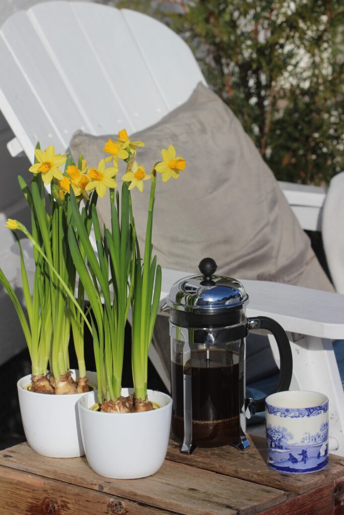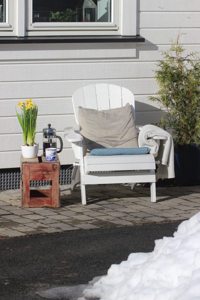 Så kom endelig den første vårdagen! I dag er det et aldeles strålende vær her. Sola skinner fra skyfri himmel, og det åpenbart at våren er i ferd med å få overtaket på vinteren. Jeg sitter i hagestolen utenfor huset og koser meg med årets første kaffekopp utendørs. Det er varmt og godt, og jeg nyter vårens første solstråler. Det er så lyst og lett ute, og himmelen er klar og blå over tretoppene. Overalt sildrer og renner det, – nå smelter de siste restene av snø i rekordfart. Her ute i skogen er det så lett å høre fuglene som akkurat nå synger av full hals. Det er nesten som om de synger ekstra mye i dag, kanskje til ære for sola som vi ikke har sett på lenge? På veien utenfor huset ser jeg noen unger som prøver å lære seg å sykle uten støttehjul. Og en liten jente som er ute og triller dukkevognen sin i vårsola. Nå er endelig våren her.