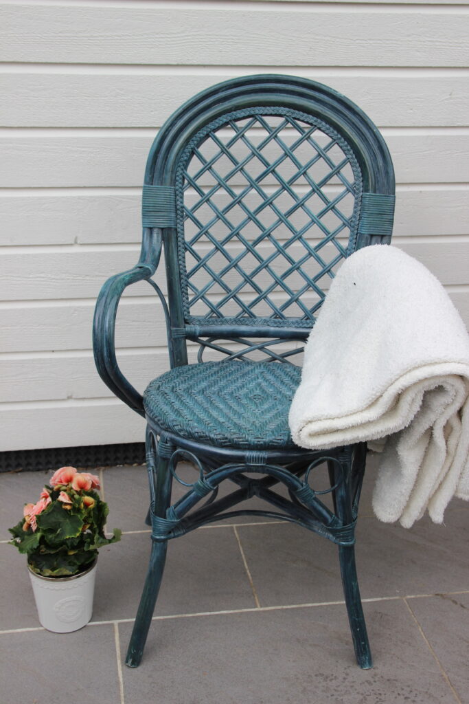 I dag har jeg vært på loppemarked, og det er jo en veldig artig årlig forteelse. Som vanlig kom jeg hjem med både det ene og det andre som jeg sikkert ikke trenger, men som er kjekt å ha likevel. De gamle utrangerte kakeformene jeg kjøpte, for eksempel, eller de eldgamle oljemaleriene. Men en ting kjøpte jeg, som jeg helt sikkert kommer til å bruke (tror jeg), og det er den stilige stolen i blå rotting du ser på bildet over. Jeg ser for meg at stolen er fin å sitte i på kveldene utover høsten og vinteren, når de lure tankene skal tenkes. Kanskje med et stearinlys på bordet foran, med en kopp te, eller kanskje med litt vin i glasset?