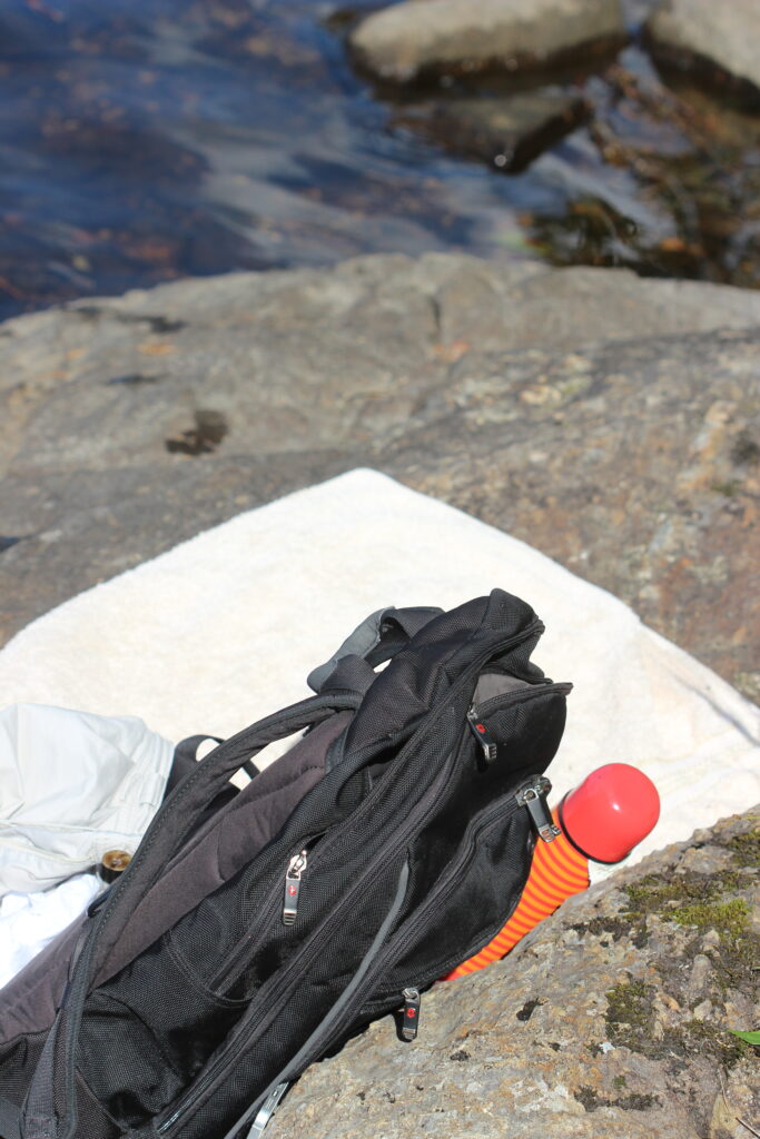 Det var som sagt en varm fornøyelse å gå gjennom skogen. Svetten silte, og det var som om klærene klistret seg til kroppen. Men til slutt – endelig – så kom jeg frem til det glitrende vannet. Og da var det bare å kaste seg uti, svømme utover og avkjøle seg. Så var det opp igjen på land, for å drikke den medbrakte teen og spise den obligatoriske hvetebollen. Og så uti vannet igjen.