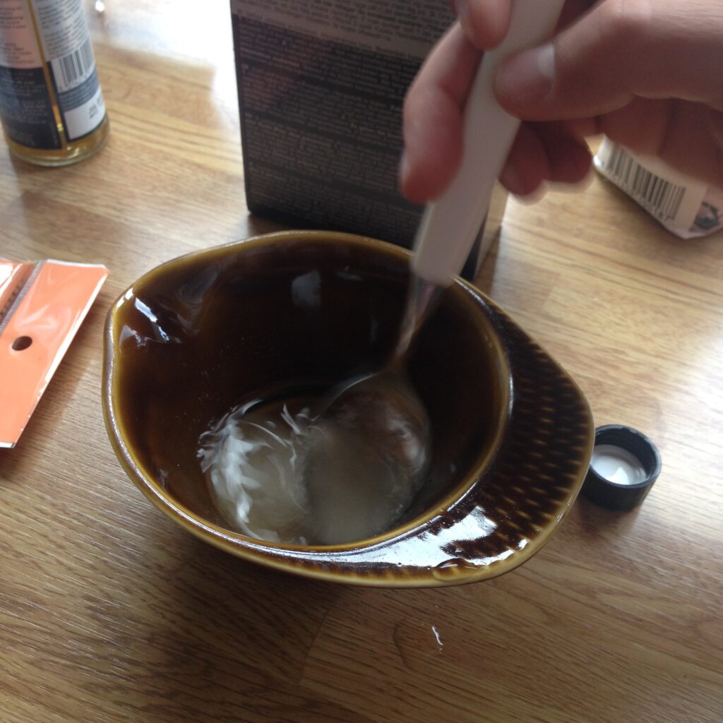 2. Risedikk blandes med litt sukker etter anvisningen på flasken, og blandes med risen. Risen er veldig klebrig, og det er litt vanskelig å røre.