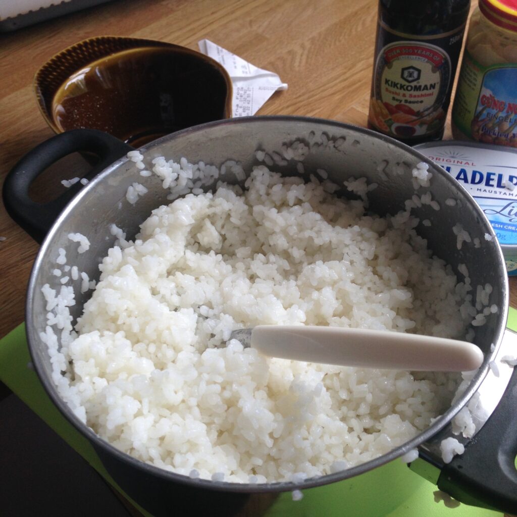 1. Først må du skylle risen, og la den stå i kaldt vann. Deretter kokes risen og avkjøles. Følg anvisningen på pakken.