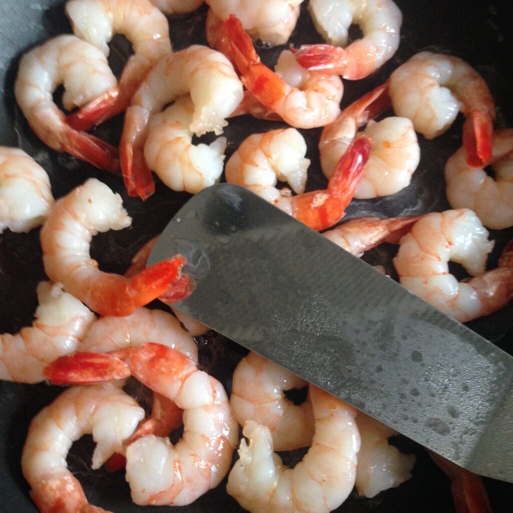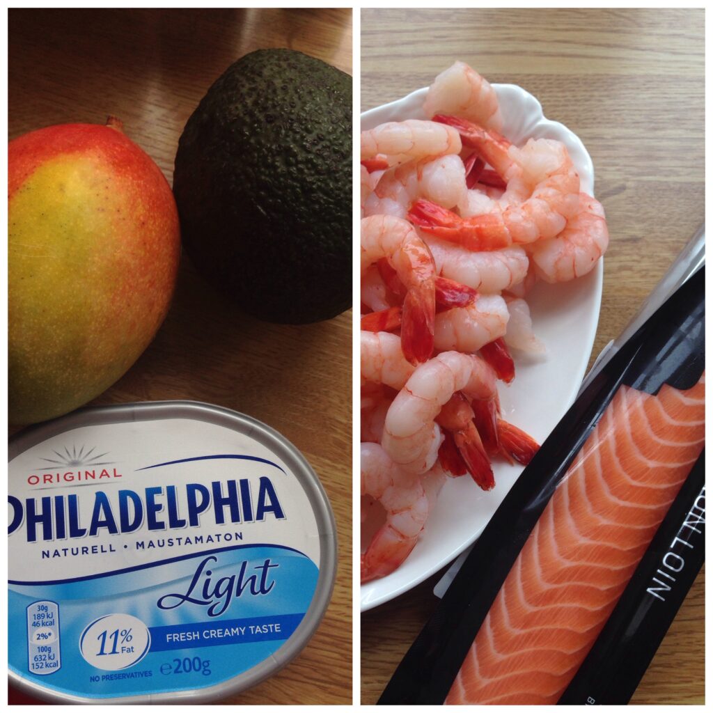 3. Laks og agurk, avokado og mango skjæres i tynne strimler. Vi stekte også scampiene på pannen noen minutter.