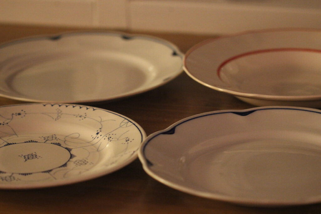 Men om en bare får tak en og annen del fra fine gamle serviser, så synes jeg ikke det gjør noe. Gamle tallerkner med fine mønstre fungerer jo veldig bra sammen, og kan brukes om hverandre. Tallerknene som du ser på hyllen kommer fra Egersund og fra Arabia. Jeg har bare noen av hver, men bruker de sammen, og blander ofte med nytt servise også. Borddekkingen kan bli variert, men også ganske artig.