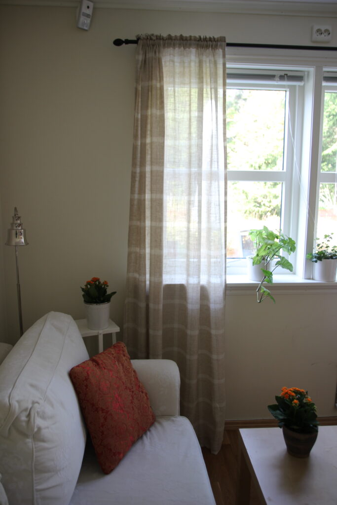 Her i forrige uke var det supertilbud på gardiner i en interiørbutikk jeg gikk forbi, og da fant jeg ut tiden var inne for en oppgradering på gardinfronten. Gardinene som jeg kjøpte kan du se på bildet nedenfor – enkle og greie, og ikke så altfor dyre.