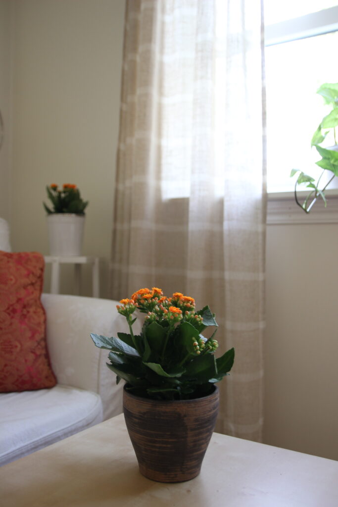 Med nye gardiner vel oppe, fikk jeg lyst til å forandre litt ellers i stua også. Så jeg hentet frem noen gamle puter fra kistebunnen, noen lysestaker og tepper, og kjøpte et par Ildtopp med høstlig farge i blomsterbutikken. Ildtoppene plasserte jeg i dertil egnede potteskjulere.