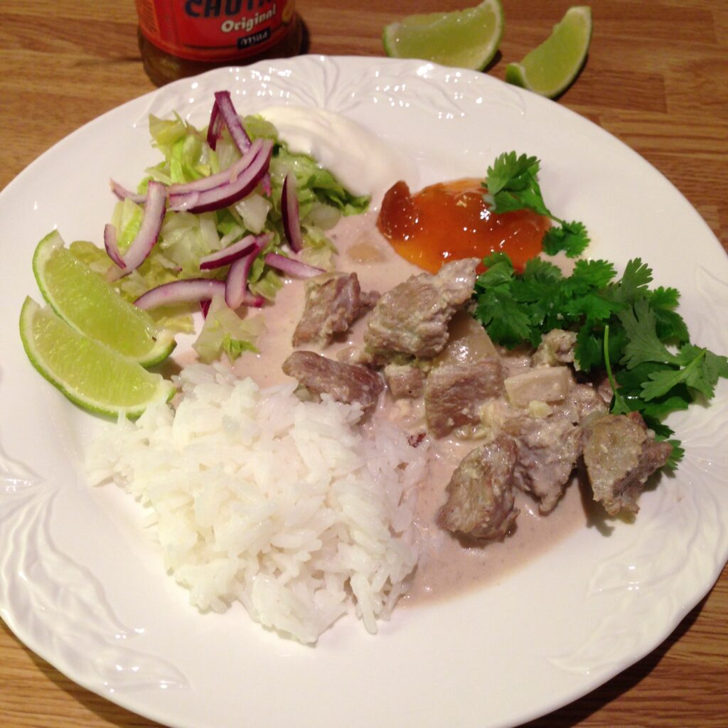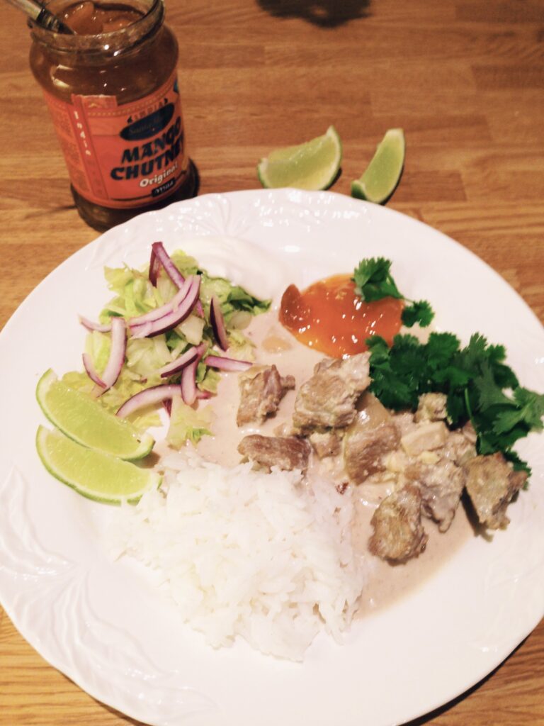 Jeg serverte retten med ris, og salat med stimlet rødløk og litt matyoghurt. I tillegg mangochutney og hakket koriander oppå.