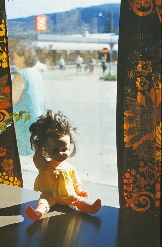 Disse bildene ble tatt en sommer helt på slutten av ti-året, og her er vi på ferietur, – jeg tror vi er på vei for å besøke familien på Vestlandet. Kjoler i den stilen som den jeg har på bildet, hadde jeg mange av. Og så klart Tjorven-dukken min er med på ferie! Bildet av Tjorven nederst er tatt litt tidligere på turen, da vi stoppet og drakk kaffe på Dokka. Og da ble det et bilde av Dokka på Dokka:).