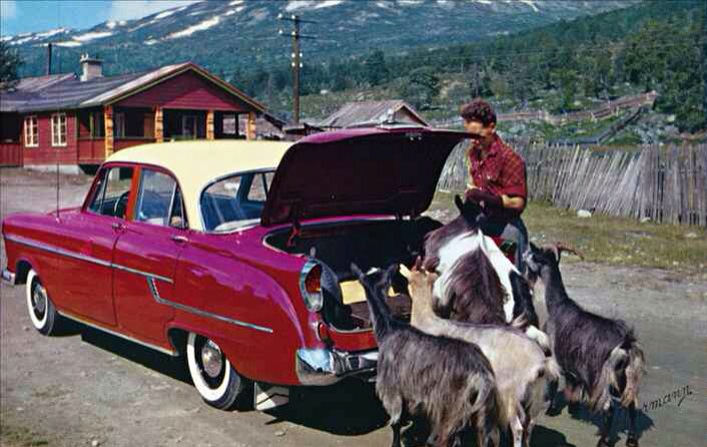 Ferieturene på 60-tallet gikk ofte på svingete veier, i bil. Det skjedde ikke så rent sjelden at man møtte husdyr langs veien. Hele familien var med i bilen, -foreldre, unger, og av og til besteforeldrene. Bilene ble overfylte, og ungene ble plassert på fanget eller på hattehylla. (sammen med de broderte bilputene). Det var vanlig å ta seg en røyk i bilen, og sikkerhetsbelte var det nesten ingen som tenkte på.