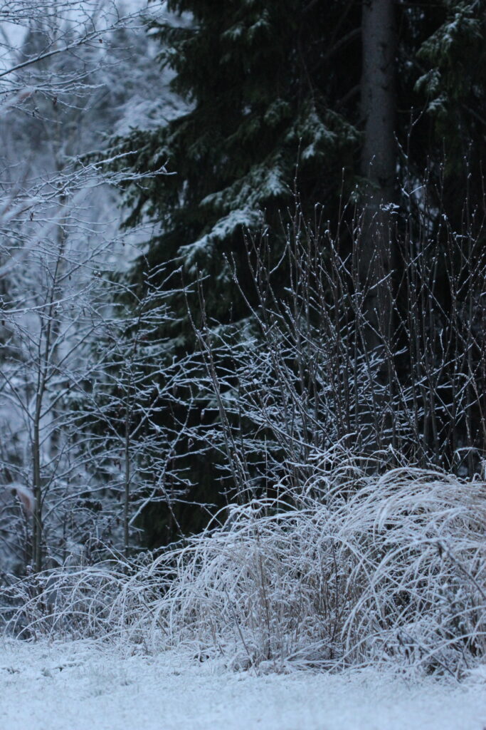 I går var det en nydelig barfrostdag her. Bare noen få minusgrader, og hvitt overalt. Langs veien der jeg gikk var busker, strå, gress og bartrær helt tilfrosset. På slike friske dager er det flott å gå tur langs sti og vei.
