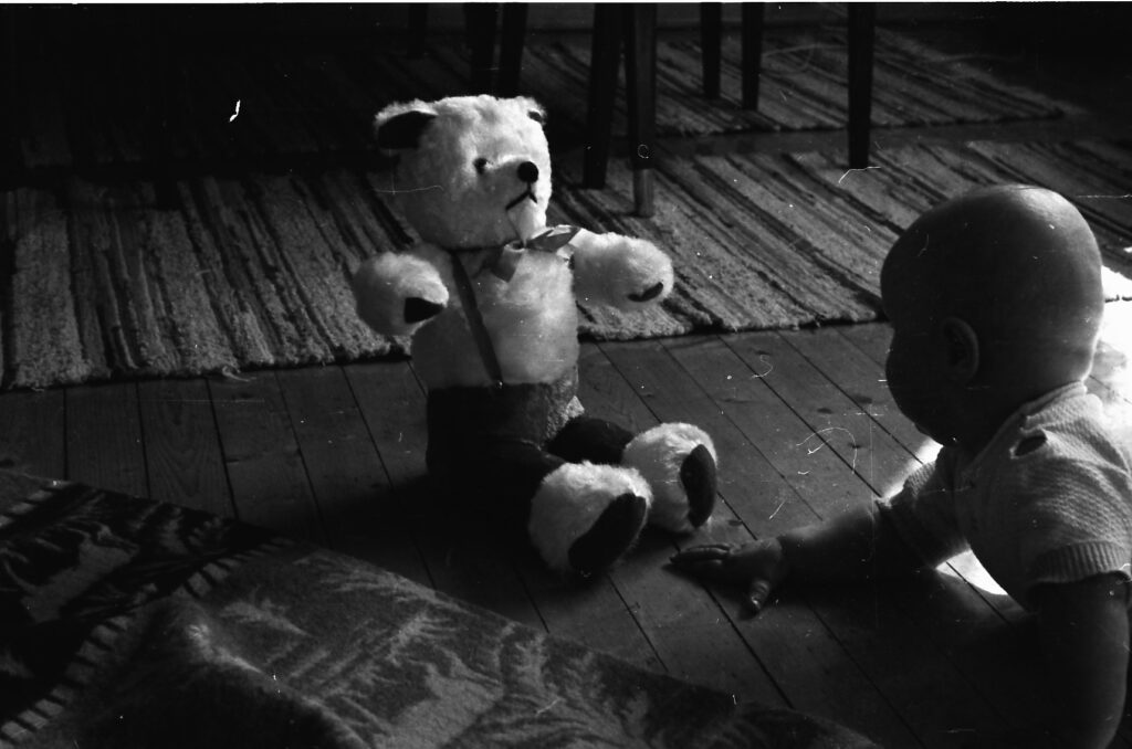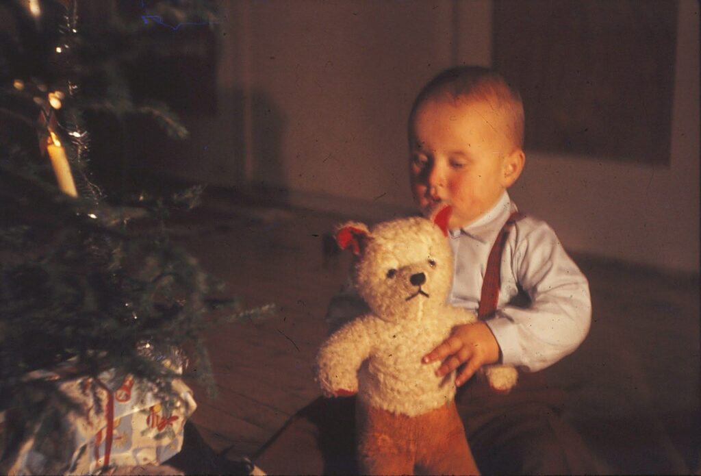 Disse bildene viser min bror Bjørn sammen med sin kjære teddybjørn, og de er tatt på begynnelsen av 60-tallet en gang. På 50-, og 60-tallet var nok teddybjørnen det aller vanligste kosedyret, og en teddybjørn var en kjær venn for barn, og en viktig del av barnekulturen. Slik har det forresten vært for generasjoner både før og etter også.