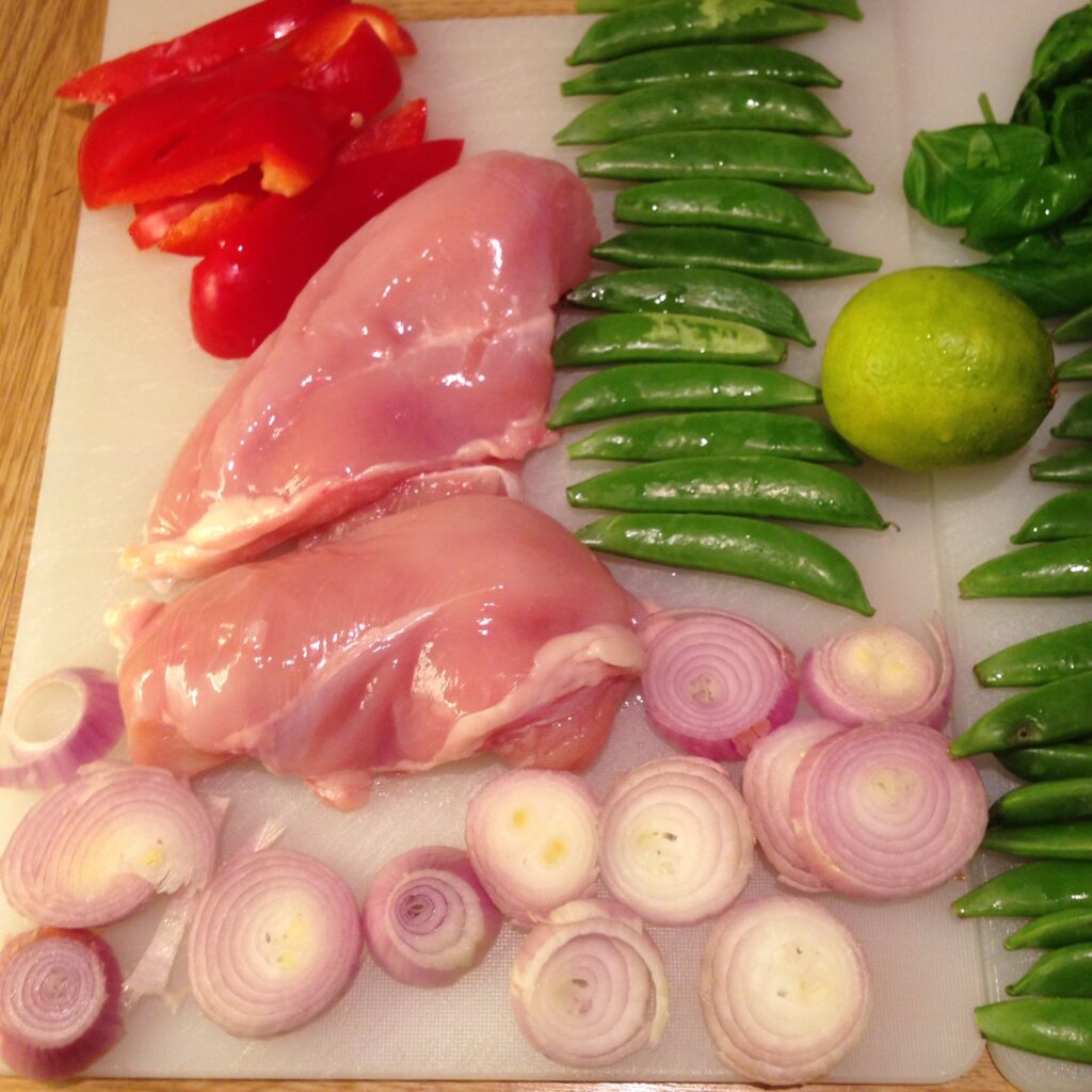 Legg kyllingen og kok den sammen med grønnsakene til alt er gjennomkokt, ca 10 minutter, eller litt mer. Rør inn basilikum, fiskesaus og limesaft. La retten hvile i 5 minutter. Smak evt til med litt mer fiskesaus eller salt.
