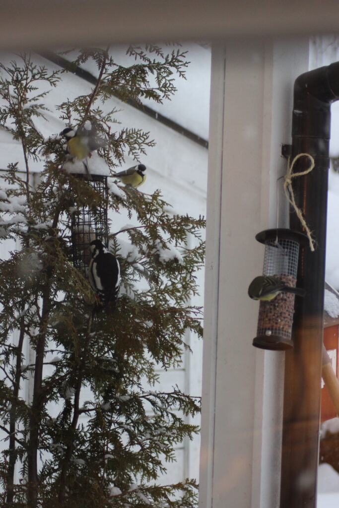 Foringsplassen for fugler blir mer og mer populær, og denne helgen har jeg hatt besøk av fugler som jeg aldri før har sett. Noen som vet hva den svartspragelte heter? Den var ganske stor.