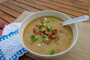 Ertesuppe og pannekaker er en favorittrett for mange. Nedenfor følger en vegetarvariant av retten. I oppskriften er pannekakene laget med