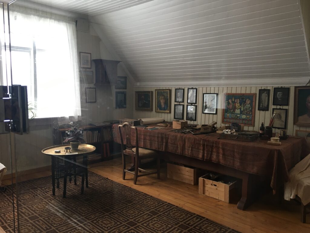 Atelieret er innredet tilnærmet lik det originale. Her kan vi se det lange bordet med malingsflekker. Her er det maling og pensler, frakken hans henger der, og det er bildene som han eide som henger på veggene.