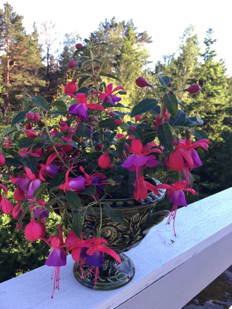 Det var strålende sol da vi ankom hytta. Som alltid kjøper jeg med noen blomster til hytta, og denne fuksiaen passet fint til potteskjuleren som jeg også kjøpte på bruktbutikken.