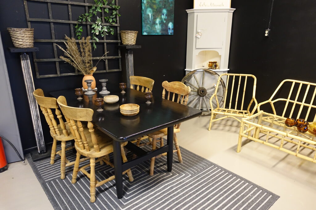 De selger veldig fine redesignede bord, stoler, benker, skap og kommoder.