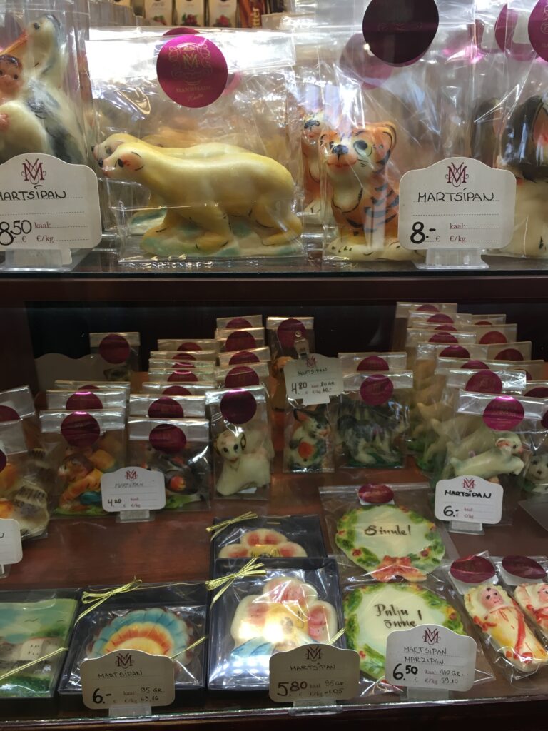 Fra marsipanbutikken. En butikk som i over hundre år har solgt håndlagede og håndmalte marsipanfigurer. Ved siden av denne butikken lå en av de eldste caféene i Estland.