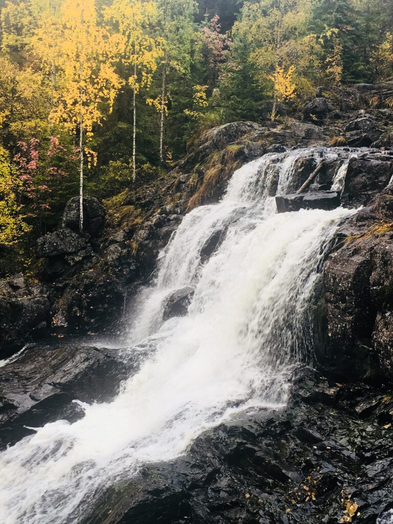 Vi gikk langs Mesnaelva på Lillehammer, vår barndoms favorittur! Der var det veldig fint akkurat nå. Raslende gyldent løv og skummende hvitt vann i utallige fossefall.
