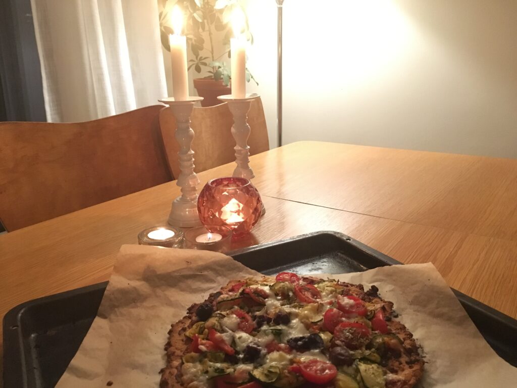 Pizza på en fredag. Denne ser litt spesiell ut, fordi bunnen er glutenfri. Du finner oppskriften her.