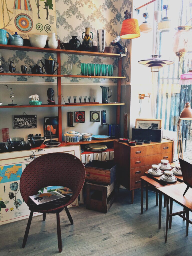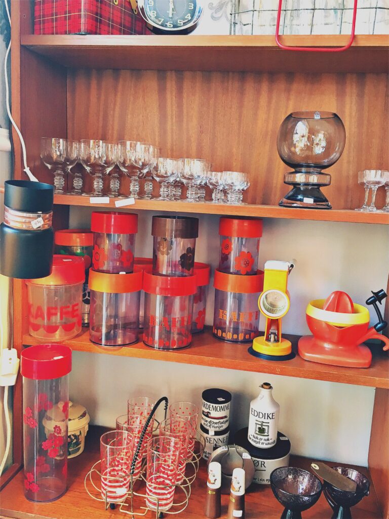 Som du kan se på bildene så har butikken et flott utvalg av retrogjenstander. Det er mye typiske gjenstander fra 50-, 60-, og 70-tallet; fargerike og mønstrede bokser og glass, serviser, emalje, møbler, bilder og lamper, og mye mer. Prisene er helt overkommelige, omtrent på samme nivå som i lignende type butikker i markedet.