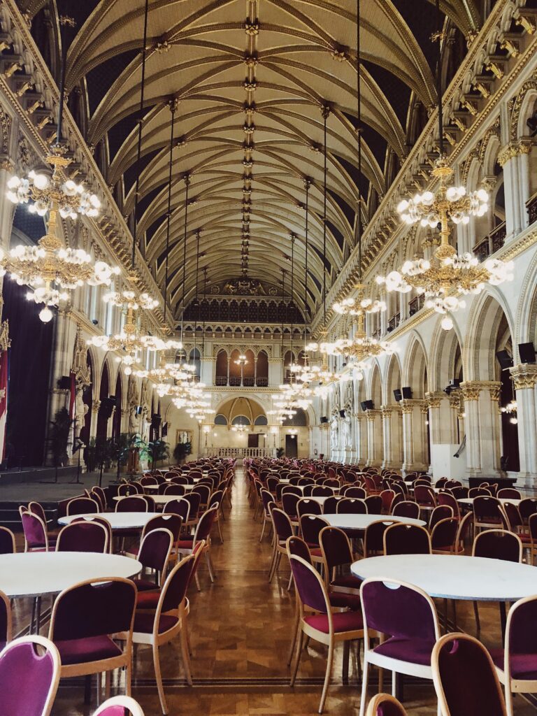 Bilde fra Rådhuset Wien. Rådhuset er ikke er bare et sted for politikk og styring av byen, det har også ballsaler. Mange ballsaler! Flere ganger i året blir det arrangert store ball i rådhuset, og da blir det ikke spart på noe.