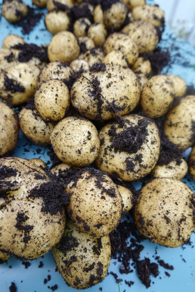 Poteter er kjempelette å få til. Jeg fikk mange kilo ut av bare tolv settepoteter i én plantekasse.