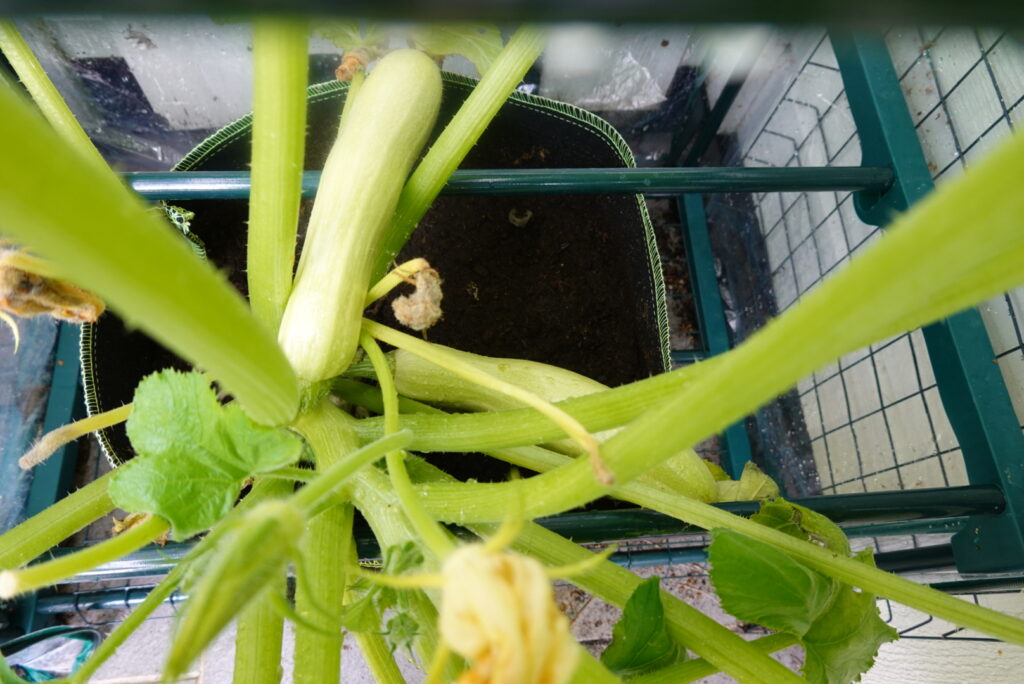 Squashen ga svært god avling, med mange frukter fra noen få planter. To squashplanter er best i en plantekasse har jeg funnet ut. De holdt seg lenge i kjøleskapet utover høsten, så det ble skikkelig matauk. Gresskarene kom også fint.