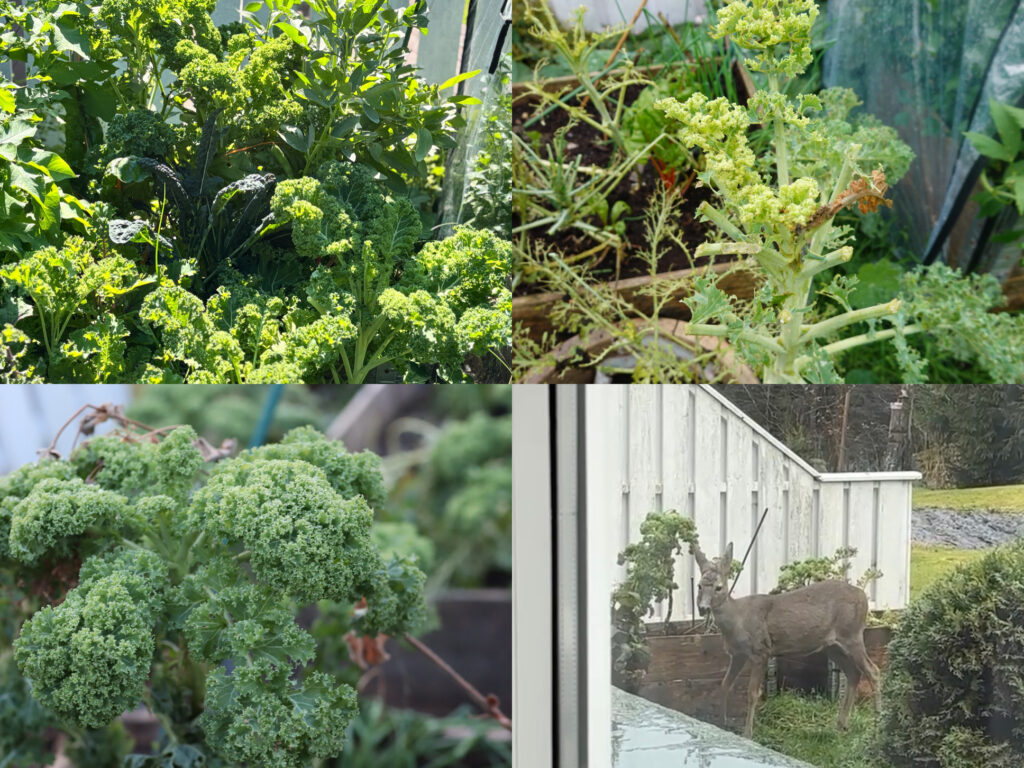 Grønnkål er min store favorittgrønnsak, og jeg har alltid lykkes med den tidligere – men ikke i år. Den kom først fint opp, men ble etter hvert helt spist opp av kålflue. Senere på høsten kom den fint tilbake. Så fikk hagen besøk av en flokk rådyr som koste seg noe skikkelig med det som hadde kommet tilbake. Det er ikke alltid lett å være hobbydyrker…