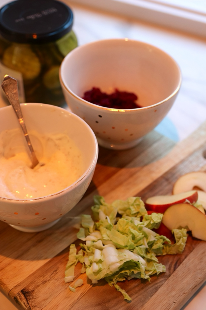 Rør sammen alle ingrediensene til dressingen og smak til. Varm burgerbrødene (eller brødet) og rødkålen lett. Varm ribbestykkene lett. Jeg brukte airfryer, men du kan også bruke vanlig stekepanne. Smør brødene med dressingen og legg dem sammen med skiver av ribbe og eple, rødkål, syltet agurk og salat.