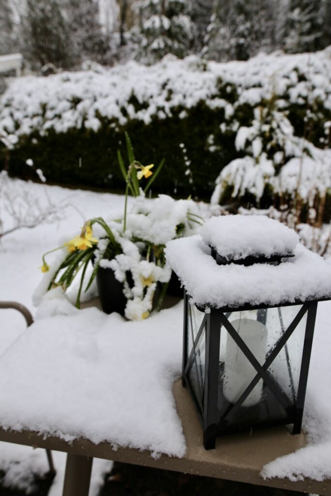 På søndag våknet jeg til full vinter – igjen. Det var en skikkelig snødag, og det skiftende været skulle vise seg å prege hele påsken.