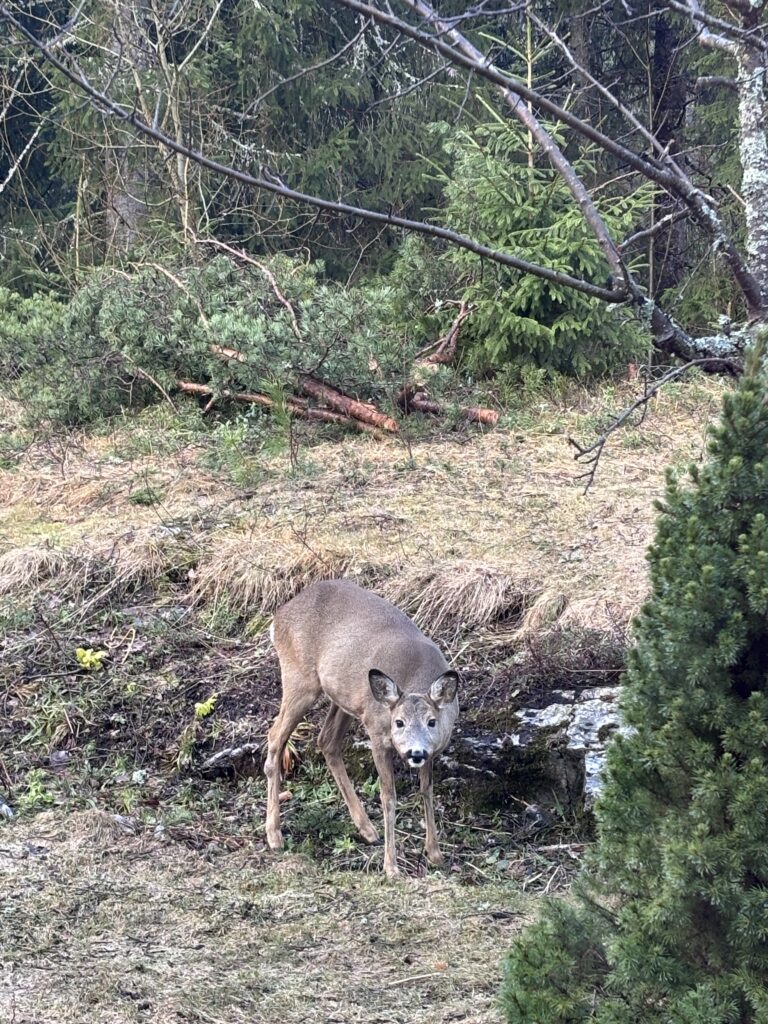 Påsken hadde knapt begynt før jeg fikk besøk i hagen av dette fine rådyret og broren hennes. Og med det var det farvel til sesongens tulipaner. Sukk. Forhåpentligvis står noen igjen. Merkelig hvor tamme de er forresten, denne sto rolig og tittet på meg, mens jeg både filmet og tok bilder gjennom vinduet, – bare noen meter unna.