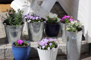 På noen av bildene nedenfor, ser du hva slags blomster jeg valgte i blomsterkrukkene utenfor huset i fjor. Jeg satser