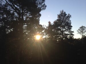 Det er tidlig morgen en av de første dagene i desember. Over trekronene i skogen utenfor huset har det såvidt