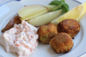 Her kommer et forslag til en god matrett for helga; kikertboller (falafel) servert med gulrottzatziki og ovnsbakte potetbåter. Jeg lagde