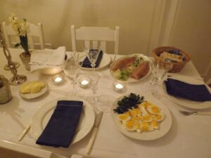 På menyen på vårt lille førjulsselskap i går sto rakafisk, servert med purre, egg, lefse, lettrømmme, poteter og godt smør.(mengde